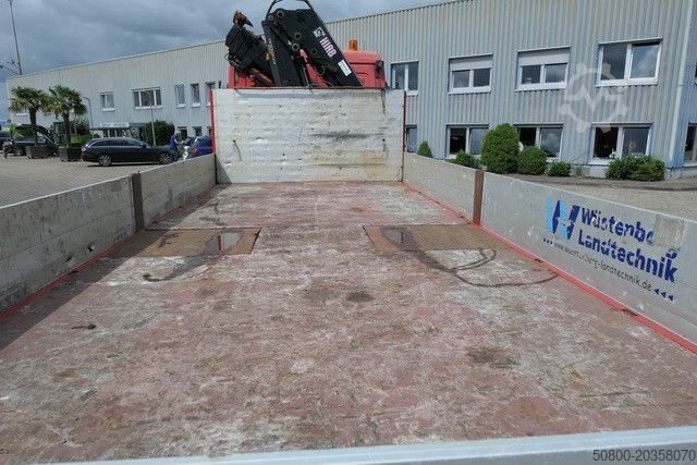 Flatbed body, aluminum side walls 1 xx divisible 400 mm, raised front wall approx. 1200 mm, screen-printed floor, HIAB medium crane type: 144E-3 HIDUO, point support, radio remote control, floor operation on the left, 3 step(s) hydraulically extendable, diagram: approx. 2.4m - 5600kg, 4.6m - 2100kg, 8.3m - 1580kg, 10.4m - 1240kg, tech. possible: crane with 3 mech. Extensions extendable to 12.6m - 960kg, 15.0m - 760kg, and 17.0m - 620kg, with a hanging rail for loading ramps at the rear, Duo-Matic brake connection, stainless steel toolbox, Telligent ABS/ASR braking system, rear differential lock, engine brake, hill lock, cruise control, Telligent gearshift, analog tachograph, air conditioning, auxiliary heating, heated and electrically adjustable exterior mirrors, electric windows for driver and passenger doors, driver's comfort suspension seat, 1 sleeping bed, cool box, roof hatch, fog lights and auxiliary lights, 2 rotating beacons, air suspension with lifting and lowering devices for the front and rear axles. The vehicle can be covered with advertising and/or lettering.